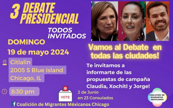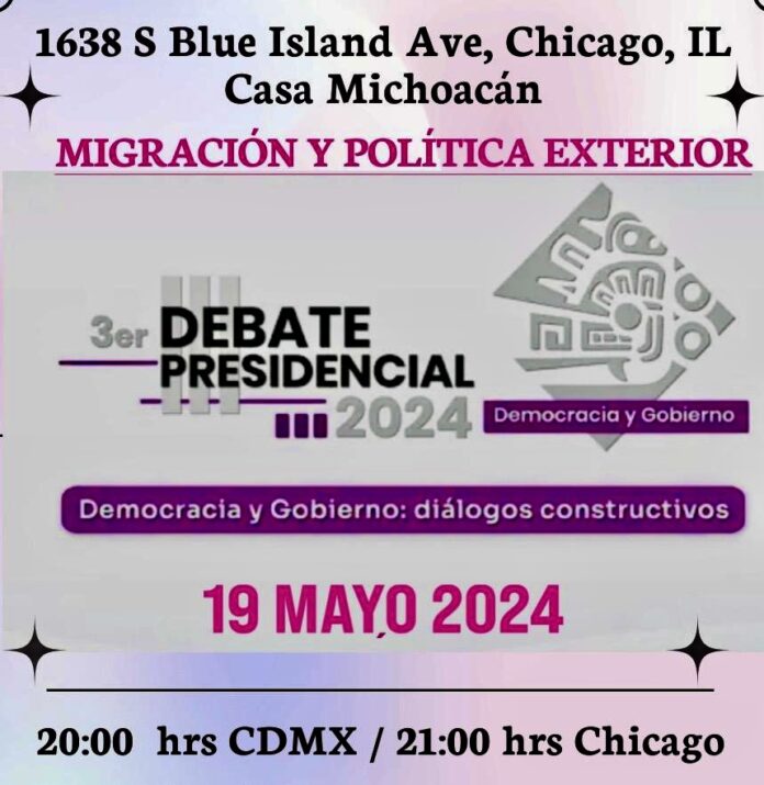 “Estamos en plena fiesta democrática en México. Eso nos motiva a invitar a nuestra comunidad migrante mexicana a que nos acompañe a ver el 3er. Debate Presidencial en el 1638 S Blue Island Avenue, Chicago, IL. 60608 a partir de las 9:00 de la noche. La cita es el domingo 19 de mayo”, dijo a este medio Artemio Arreola, líder proinmigrante de Chicago.