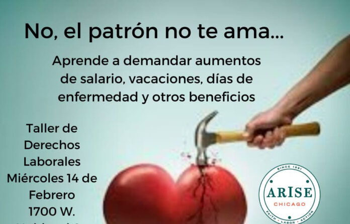 Arise Chicago está invitando a su próximo Taller de Derechos Laborales el día miércoles 14 de febrero/2024, de 6:00 de la tarde a 8:00 de la noche en el 1700 W. Hubbard St., Chicago, IL. 60622. “En el taller aprenderán cuáles son sus derechos laborales básicos y les indicaremos también, como denunciando violaciones y abusos laborales, podrán conseguir un Permiso de Trabajo en los Estados Unidos”, dijo a este medio, Jorge Mújica, destacado líder por los derechos de los trabajadores, reconocido por luchar durante décadas defendiendo los derechos laborales de los migrantes y sus familias.