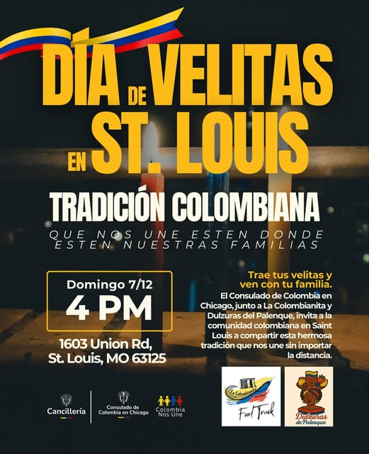 El Consulado General de Colombia en Chicago, en compañía de La Colombianita y Dulzuras del Palenque, está invitando a toda la comunidad migrante, principalmente colombiana, para celebrar en Saint Louis la hermosa tradición denominada en Colombia “El Día de las Velitas”. “Es un buen momento para compartir, y estar unidos sin que nos importe la distancia”, dijo uno de los organizadores del evento a este medio. “Celebremos con cariño y mantengamos viva la magia de la Navidad. Los esperamos”, dijo finalmente.