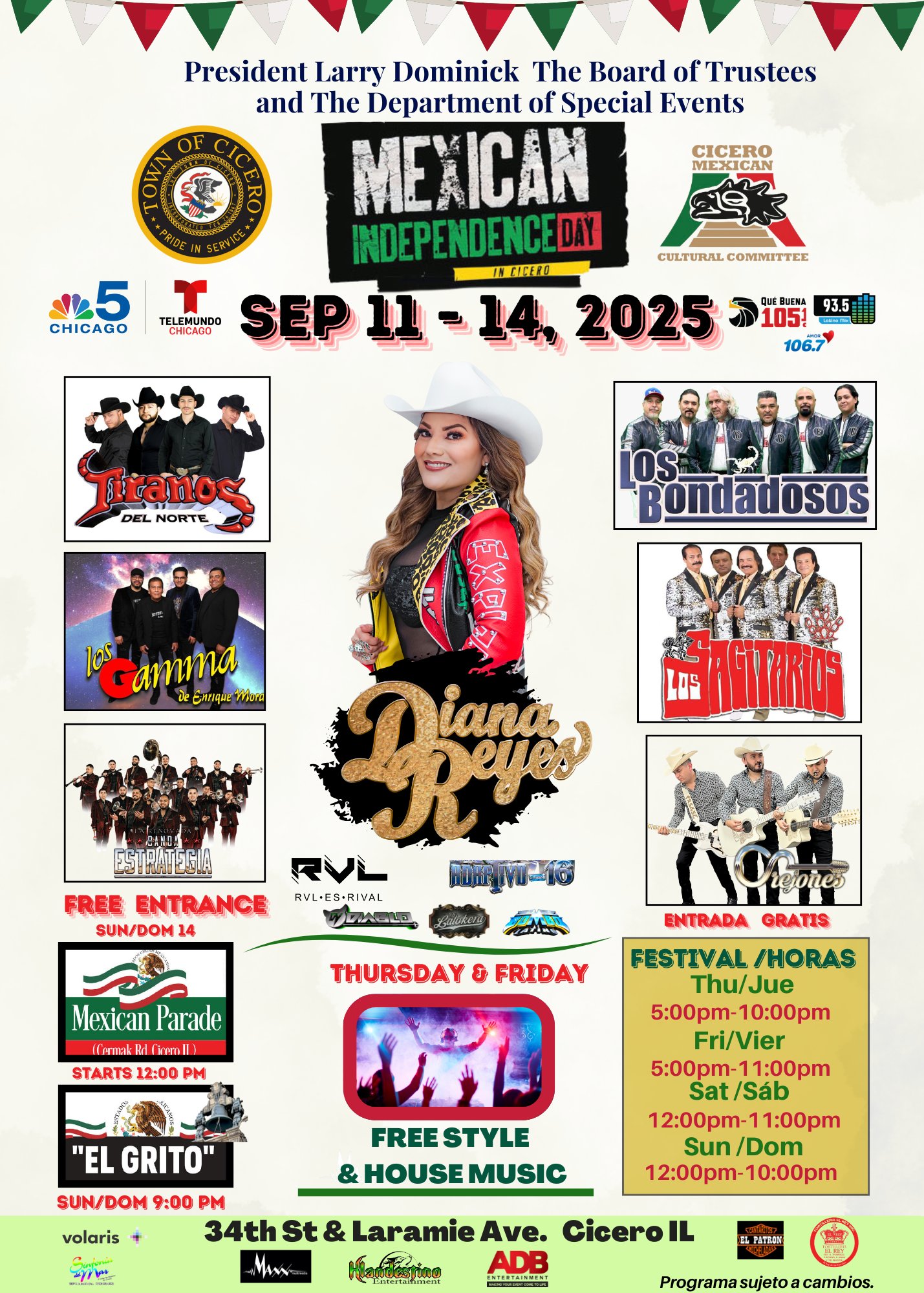 La entrada todos los días del festival (del 11 al 14 de septiembre) será gratuita. El Desfile Mexicano de Independencia será el domingo 14 comenzando al mediodía y la ceremonia del “El Grito”, esa misma noche a las 9pm.