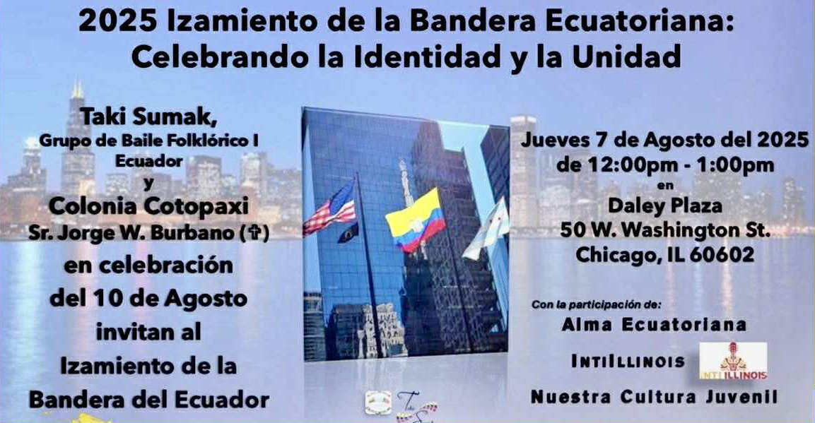 El pasado 7 de agosto se llevó a cabo la solemne ceremonia de izamiento de la bandera ecuatoriana, evento cívico cultural en el marco de las celebraciones de Independencia del Ecuador, que se conmemora cada año por estas fechas. El bonito y emotivo acto organizado por Taki Sumak & la colonia de Cotopaxi radicada en Chicago contó con la presencia de autoridades de la ciudad, funcionarios electos e importantes personalidades que se dieron cita en Plaza Daley en pleno centro de la ciudad.