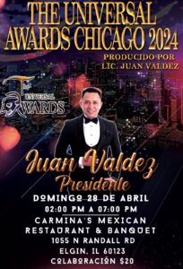 Con la producción del Lic. Juan Valdez, presidente de The Hispanic Awards GT USA, llegan al área de Illinois, específicamente en Elgin, los The Universal Awards Chicago 2024, el domingo 28 de abril, de 2:00 de la tarde a 7:00 de la noche, en Carmina’s Mexican Restaurant & Banquet del 1055 N. Randall Rd., en el suburbio de Elgin, IL. 60123. “Será una tarde-noche inolvidable, donde nos encontraremos entre amigos, nos daremos un abrazo y celebraremos los reconocimientos de cada uno de los galardonados, junto a sus familias y allegados”, dijo Juan Valdez.
