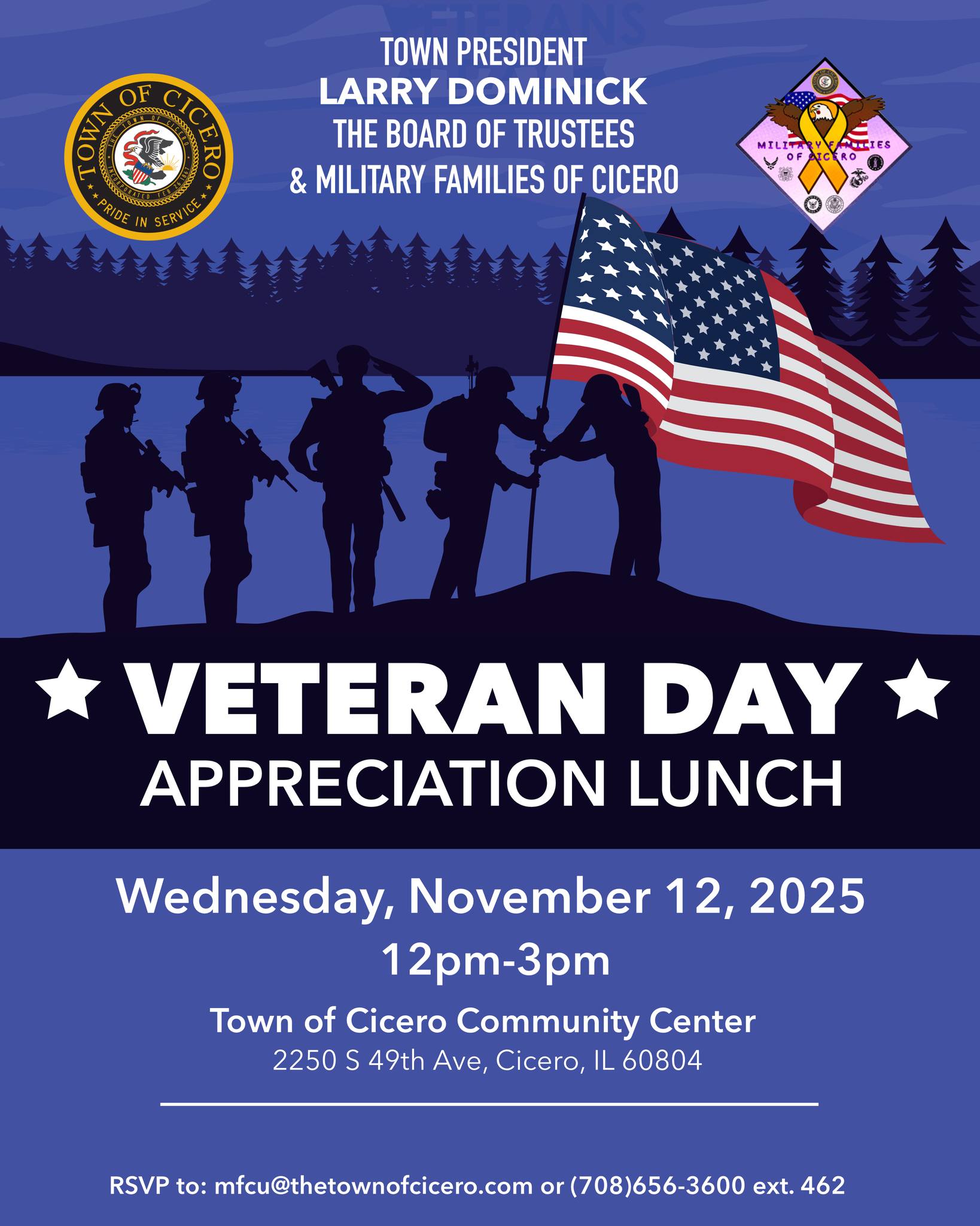 El almuerzo especial está dedicado a todo el personal activo y a los veteranos, en reconocimiento a su servicio y sacrificio por esta gran nación: los Estados Unidos de América. “¡Acompáñenos para honrar y celebrar a los valientes hombres y mujeres que han servido a nuestro país!”, expresó el gobierno de Cicero en su perfil social de Facebook.